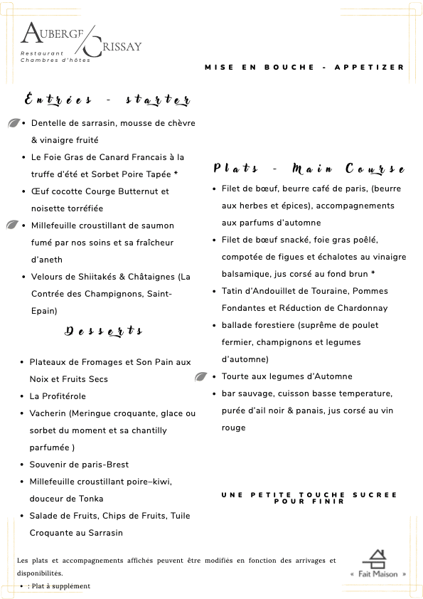 Entrée – Plat – Fromages – Dessert à partir de 50€